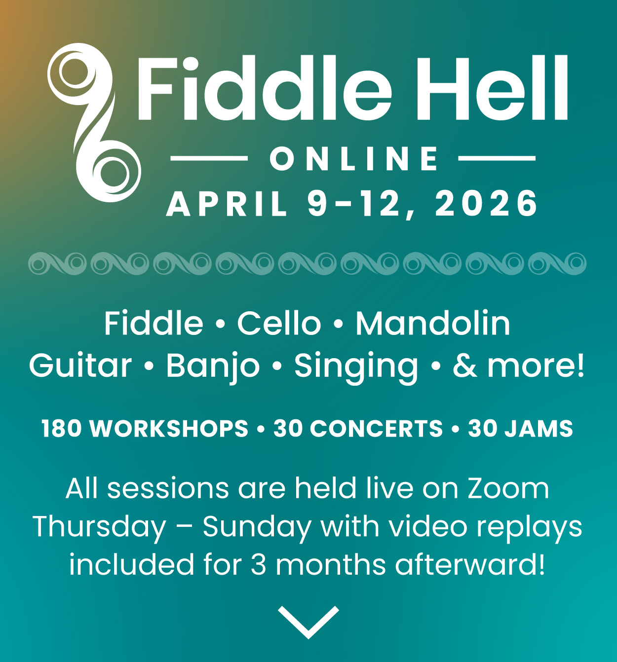 The eighth Fiddle Hell Online starts live April 9-12, 2026, with 3 months of free replays. We have 180 hands-on live workshops to learn from, 30 world-class live concerts to enjoy, and 30 artist-led live jam sessions to join on Zoom, for fiddle, mandolin, cello, guitar, banjo, & singing. That's 240 sessions! Other instruments and listeners are welcome, too.